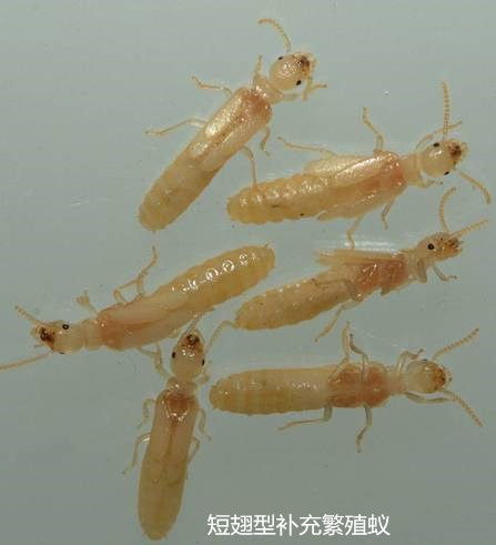 補(bǔ)充繁殖蟻有兩類:短翅型(或稱成蟲第二型)和無翅型(或稱成蟲第三型)。此種現(xiàn)象在較高級的白蟻科昆蟲的巢中比較少見。
